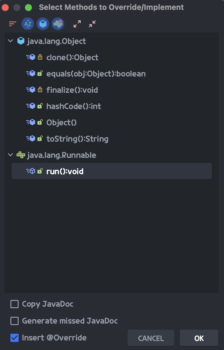 run메서드를 오버라이드 해준다. (mac : commend + o)