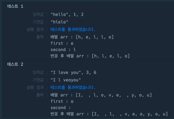 배열 arr에 num1 번째와 num2번째의 문자를 각각 first 와 second로 지정해주고,